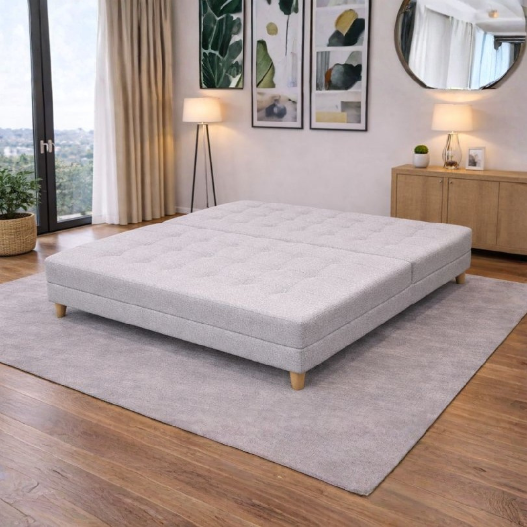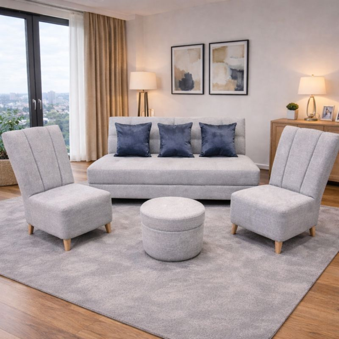 Si tu prioridad es optimizar espacio, Praga es una belleza: sofá compacto sin brazos (más espacio útil), respaldo acanalado para soporte y puff multifunción para que siempre tengas un asiento extra.